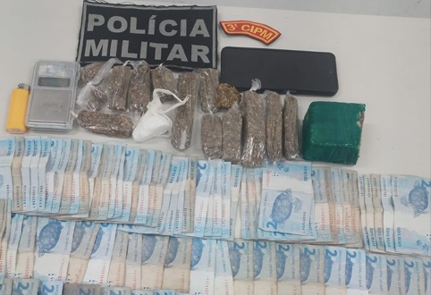 No imóvel, os policiais apreenderam uma sacola contendo aproximadamente 353 gramas de substância análoga à maconha e 25 gramas de substância análoga à cocaína, além de uma balança de precisão e dinheiro em notas de pequeno valor.